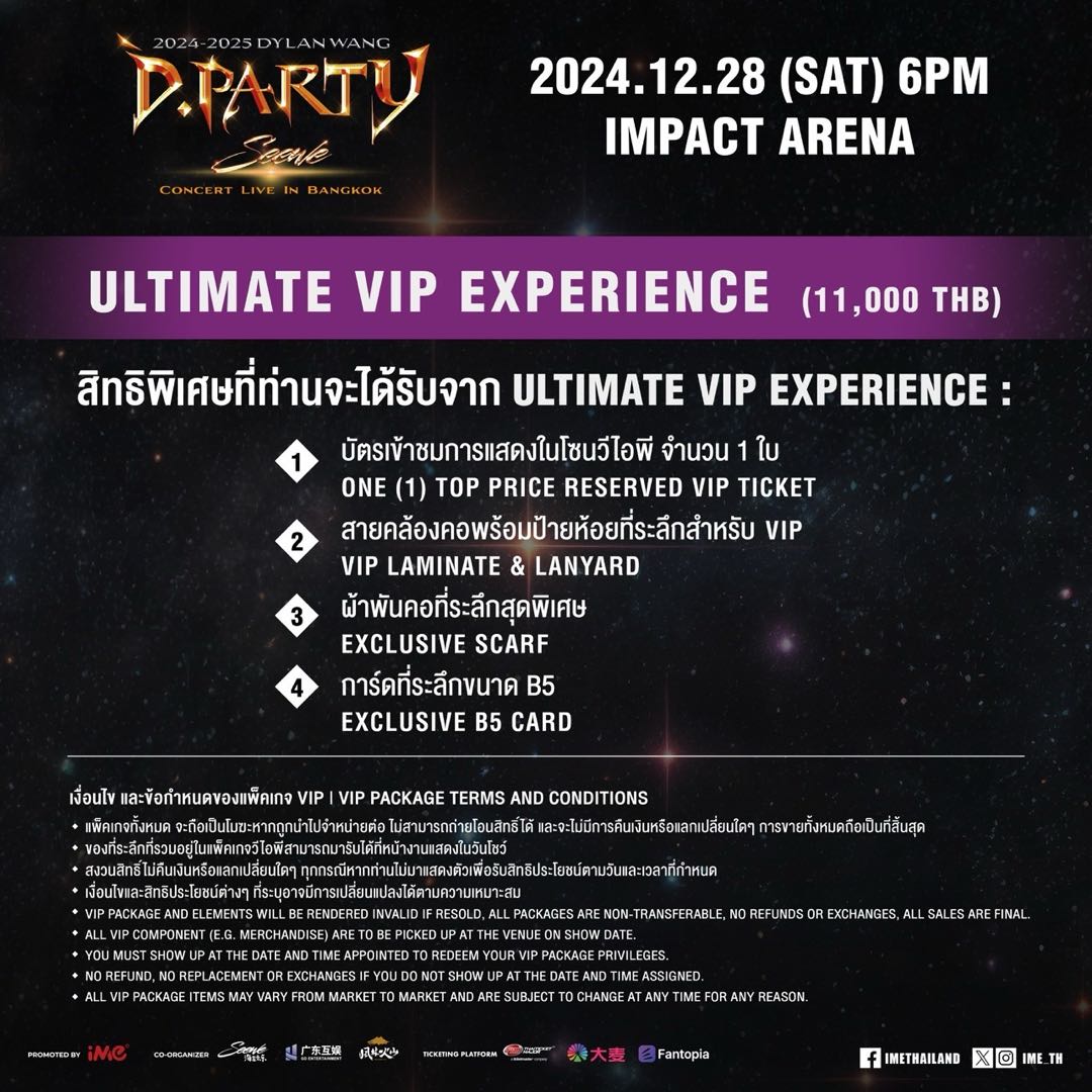 สำหรับงาน 2024-2025 Dylan Wang D.PARTY CONCERT IN BANGKOK จะจัดขึ้นในวันเสาร์ที่ 28 ธันวาคม 2567 ณ อิมแพ็ค อารีน่า เมืองทองธานี โดยผู้จัด “ไอมี่ไทยแลนด์” (iMe Thailand) พร้อมทุ่มทุนเสิร์ฟความยิ่งใหญ่ แสงสีเสียงสุดอลังการที่จะให้คุณได้ดื่มด่ำไปกับช่วงเวลานั้นอย่างเต็มที่ และจะเป็นค่ำคืนที่เหล่า ชงตี้ฮั่ว ได้มาเฉลิมฉลองสุดพิเศษ และใกล้ชิดไปกับ ดีแลน หวัง อีกด้วย ไม่ว่าคุณจะมาจากที่ไหนในงานนี้คุณจะได้รู้สึกถึงพลัง และหัวใจที่ดีแลนพร้อมถ่ายทอดออกมาผ่านทุกโชว์ส่งตรงถึงคุณทุกคน