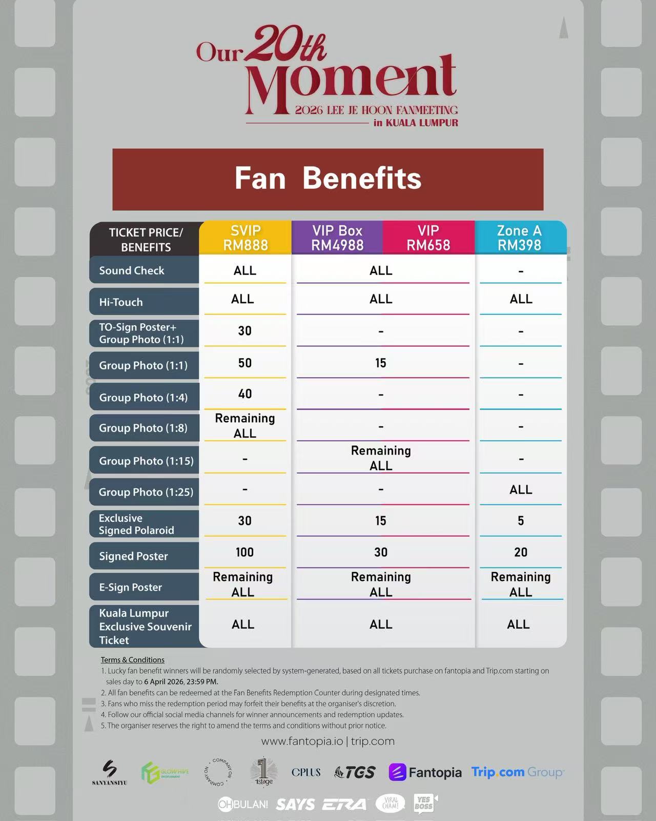 - Fan Benefits: Group Photo Session (1:25), Hi-Touch Session, Official Poster with digital sign and Kuala Lumpur Exclusive Souvenir Ticket for all;