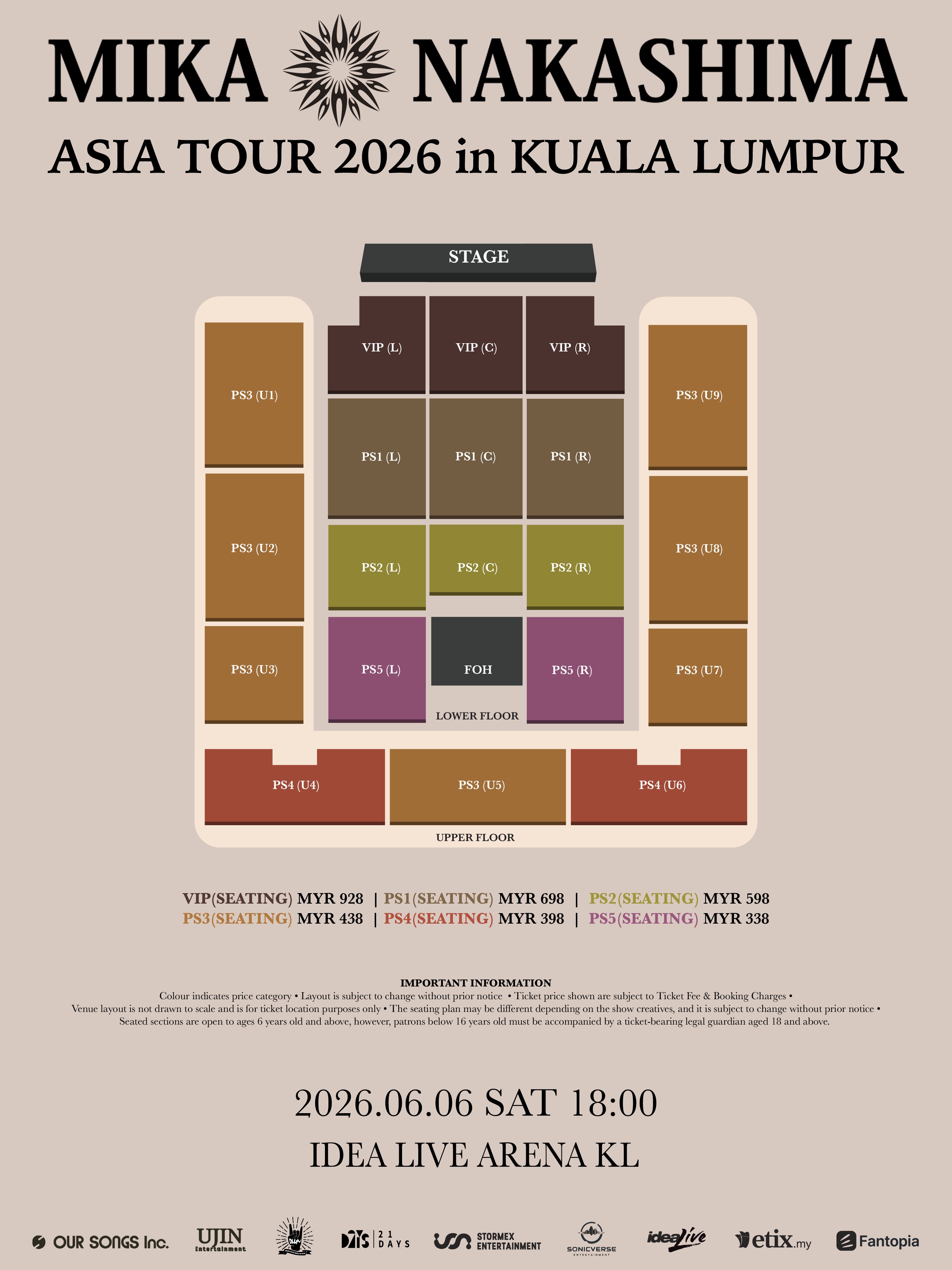 “MIKA NAKASHIMA ASIA TOUR 2026 in KUALA LUMPUR” will take place on Saturday, June 6, 2026, at 6:00 PM, at Idea Live Arena KL. The concert is organized by DON’T LIKE LOUD MUSIC PRODUCTION, with STORMEX ENTERTAINMENT as the execution company, promising a high-quality, world-class live music experience.