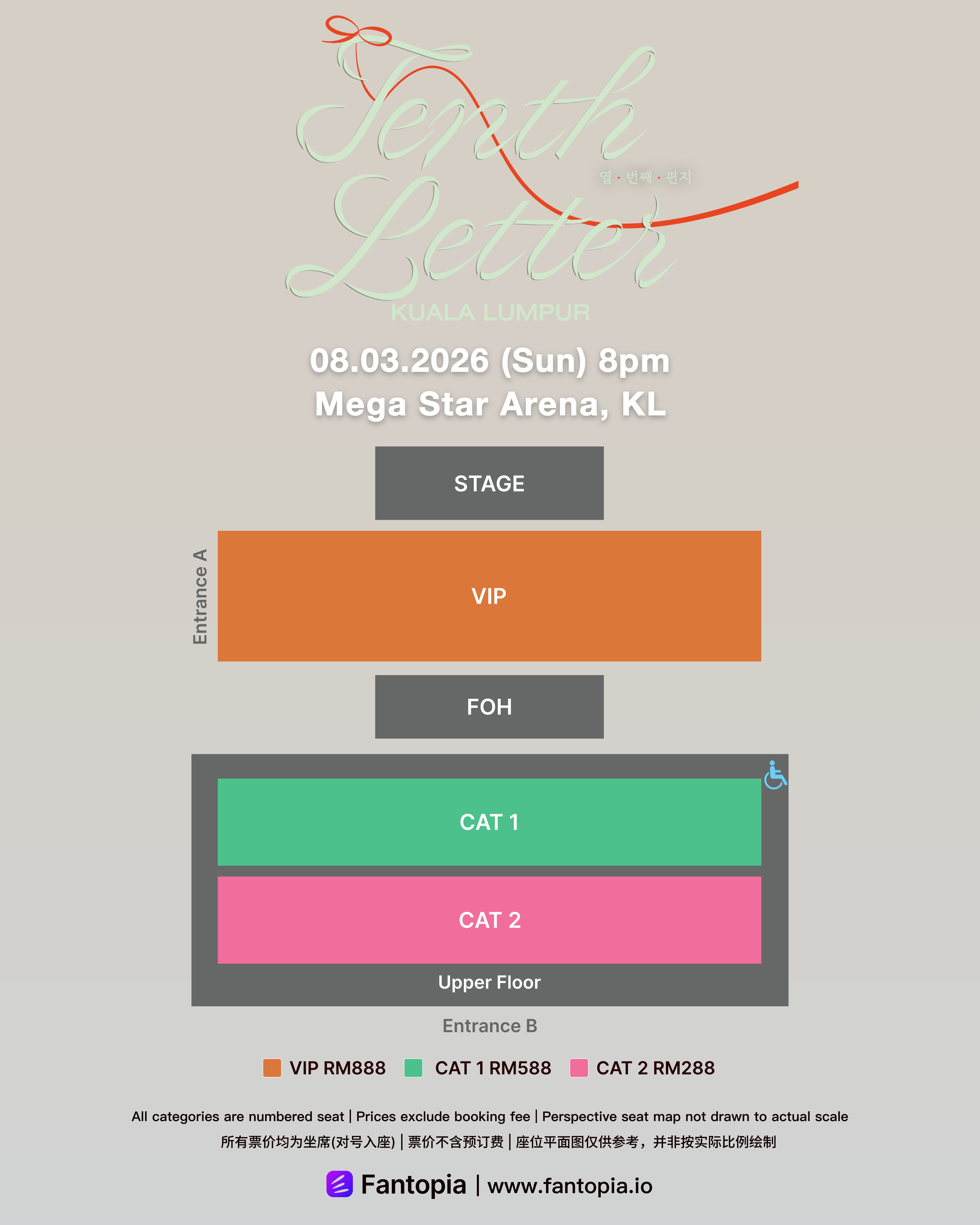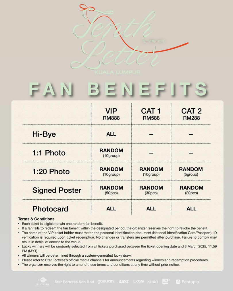 本次吉隆坡站门票共设叁种票价:RM888(VIP)、RM588(CAT 1)以及 RM288(CAT 2)。所有门票均可参与粉丝福利抽选,有机会获得 Hi-Bye 问候、1:1 合照、1:20 合照、签名海报或限定 Photocard 等不同福利。粉丝福利将以随机方式抽出,每张门票仅会享有对应一项福利。