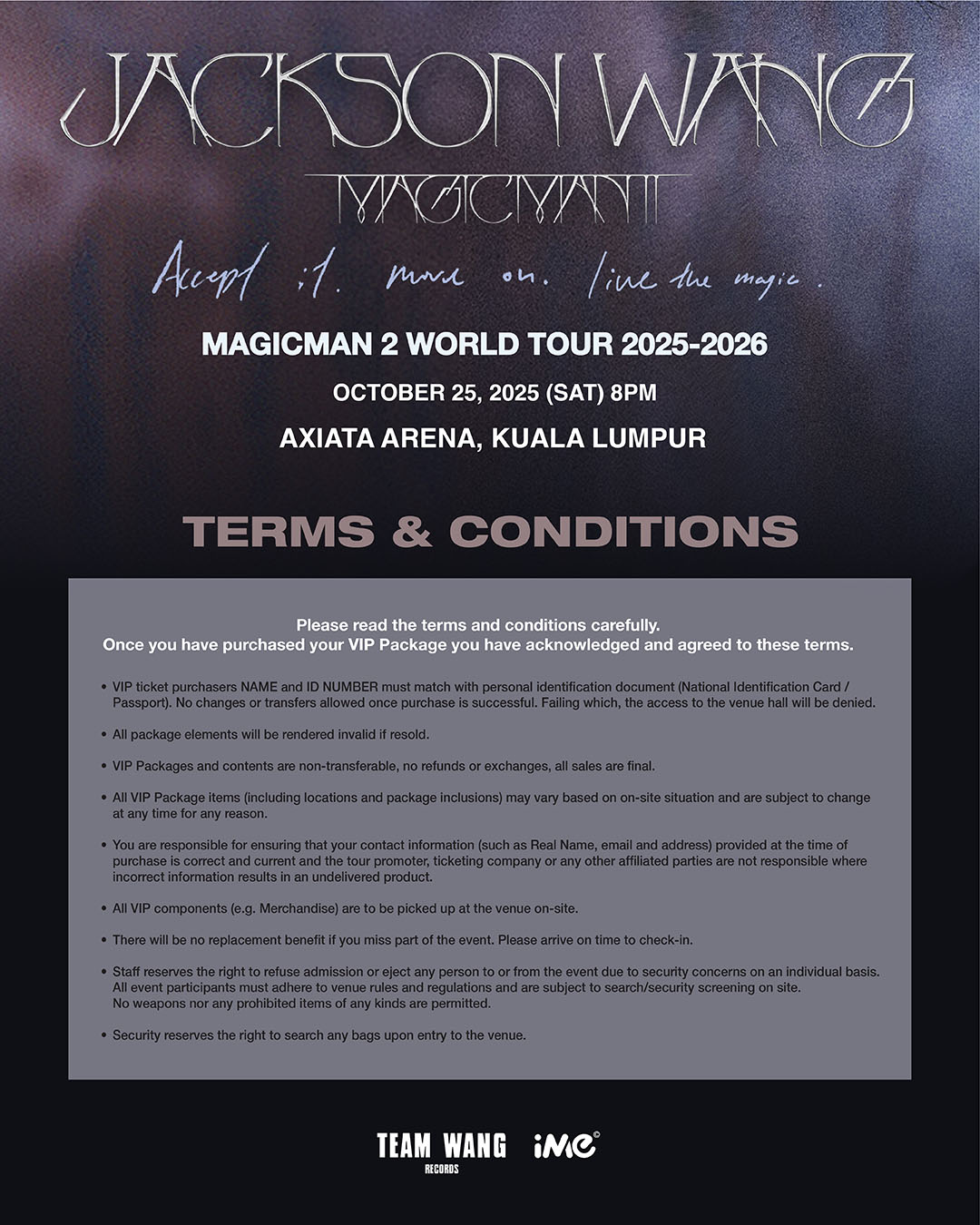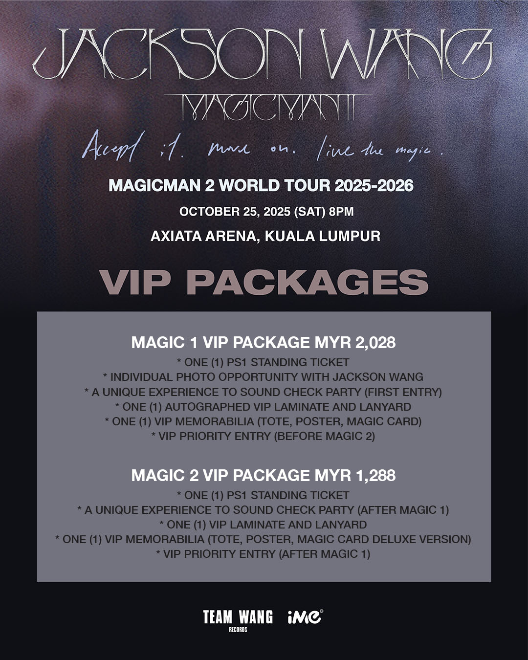 Jackson Wang has officially announced his second solo world tour, the MAGICMAN 2 WORLD TOUR 2025-2026 IN KUALA LUMPUR. The Malaysia stop will be held on 25 October 2025 (Saturday) at Axiata Arena, where he will deliver an electrifying performance. Tickets for MAGICMAN 2 WORLD TOUR 2025-2026 IN KUALA LUMPUR will go on sale 15 September at 12PM (MYT). This marks Jackson’s return to Kuala Lumpur after his previous Malaysia concert in 2023!
