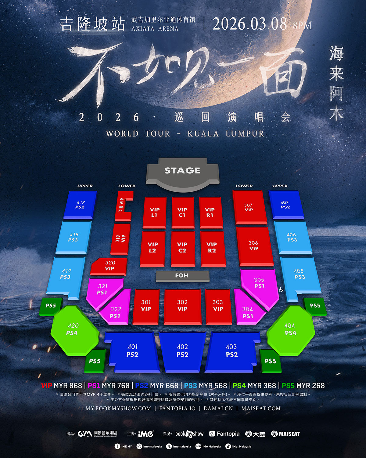 票价信息(全场对号⼊座): (VIP) MYR 868 / (PS1) MYR 768 / (PS2) MYR 668 / (PS3) MYR 568 / (PS4) MYR 368 / (PS5) MYR 268