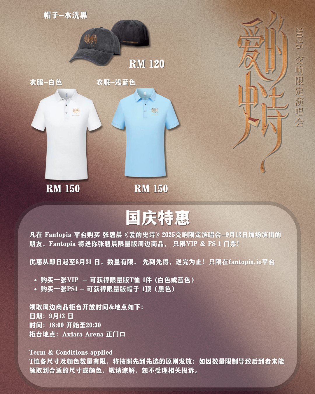 凡在Fantopia平台购买张碧晨《爱的史诗》2025交响限定演唱会一9月13日加场演出的朋友,Fantopia将送你张碧晨限量版周边商品,只限VIP&PS1门票!