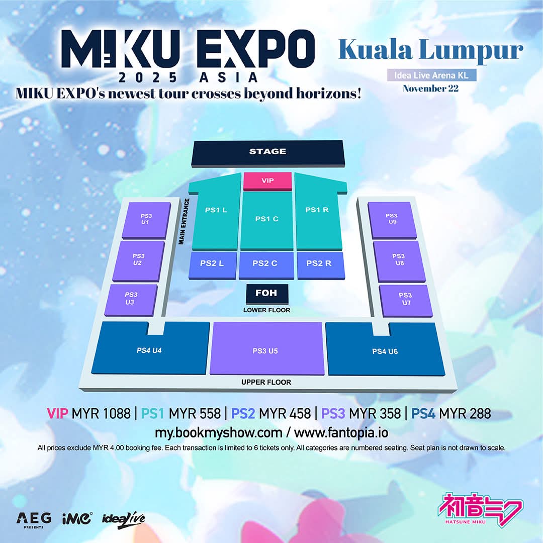 Promoted by AEG Presents Asia, tickets for HATSUNE MIKU EXPO 2025 in KUALA LUMPUR will go on sale July 22 (Tuesday), 12PM MYT. Tickets will be available via my.bookmyshow.com and www.fantopia.io.