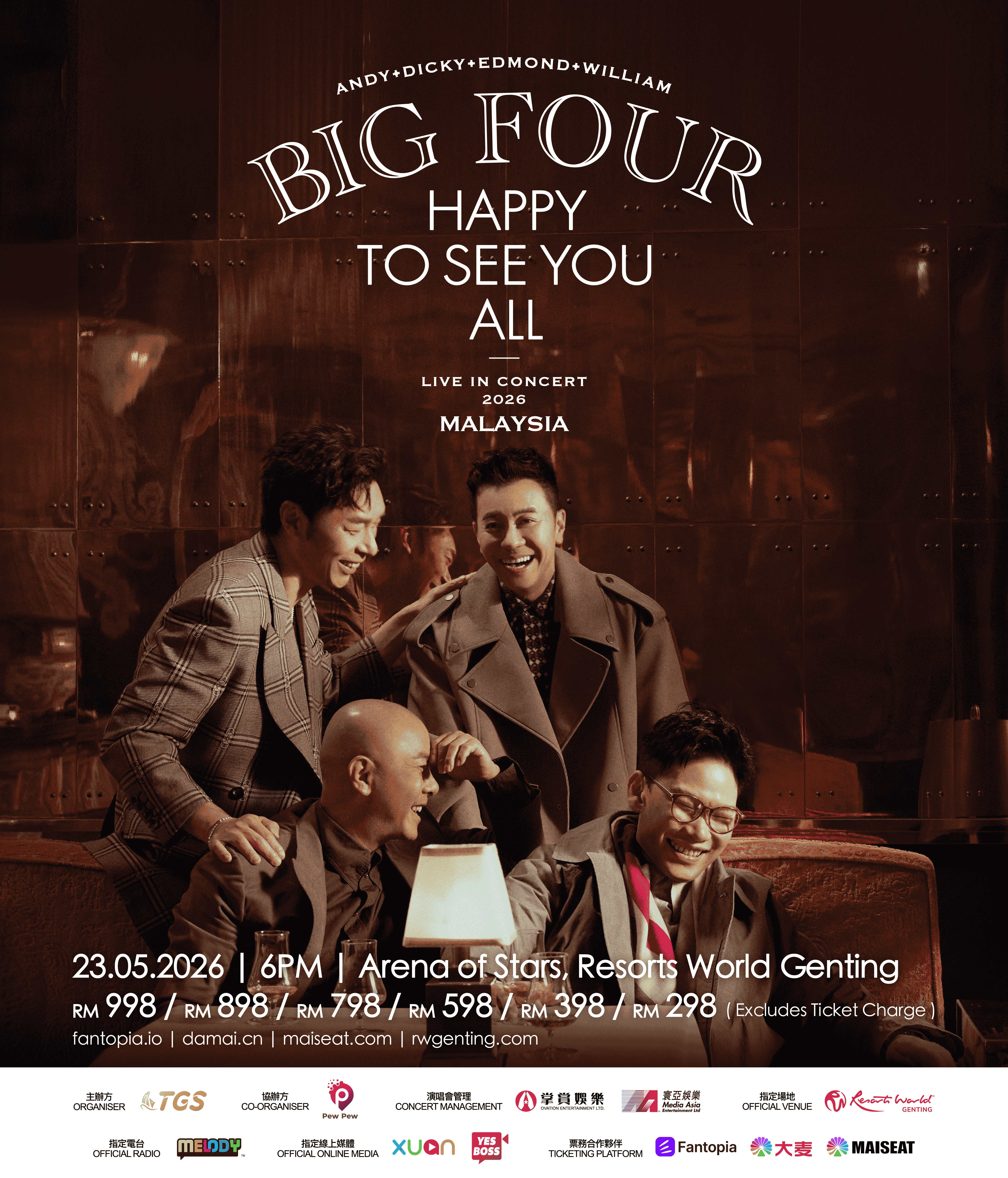 TopGallant Show超帆娱乐主办,Pew Pew协办 《BIG FOUR HAPPY TO SEE YOU ALL演唱会》马来西亚站将于5月23日,傍晚6时在在云顶世界云星剧场举行。演唱会门票将于3月26日中午12 时公开发售,欲知更多详情,可浏览【TopGallantShow 超帆娱乐 】官网及官方社交媒体平台。